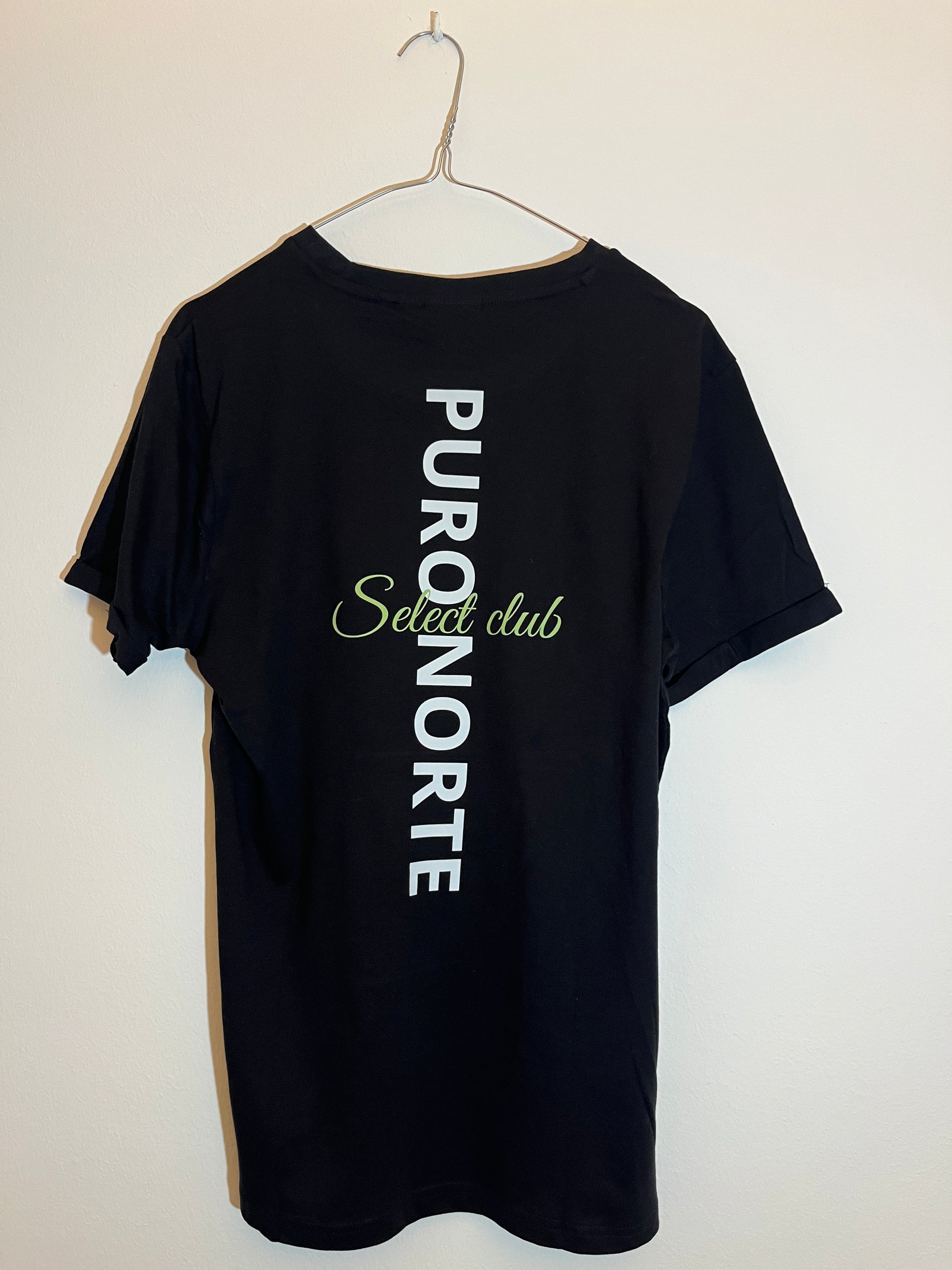 Confeccionada en color negro, presenta un diseño vertical en la parte trasera con el nombre PURO NORTE en tipografía blanca de alto contraste, acompañado del detalle “Select club” en un elegante tono verde que aporta distinción y personalidad.